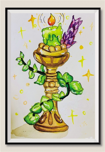 这幅作品用色大胆,果绿色和金黄色形成强烈对比,小朋友用线条细致勾勒出了烛台和蜡烛的形态,画得非常有立体感。