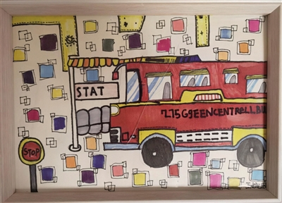 这幅作品颜色非常鲜艳,巴士的形态画得生动有趣,小作者用丰富的色块当作背景更凸显出了主体物,让人眼前一亮。